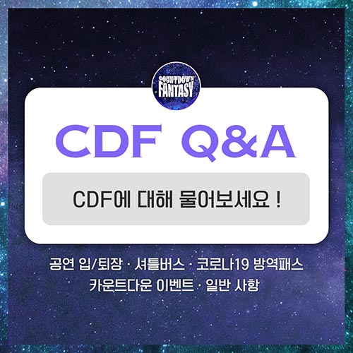 CDF 2021-2022 자주 묻는 질문과 답을 정리했습니다. 입·퇴장, 셔틀버스, 카운트다운 이벤트 등 관련된 자세한 사항은 공식 SNS (instagram @countdownfantasy)를 통해 확인하실 수 있습니다.