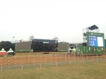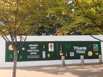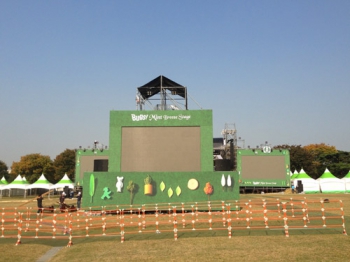 88잔디마당을 둘러싼 가설벽에 디자인 현수막들을 부착했습니다. / 점점 완성에 가까워지고 있는 민트 브리즈 스테이지, 콘솔 뒤에서 바라본 모습.