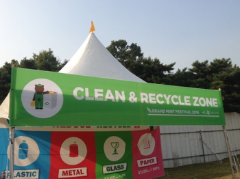 현장 곳곳에 설치되는 Clean & Recycle Zone. 분리배출과 쓰레기 처리는 이곳에서 가능합니다. / 무대 세트 작업 중인 러빙 포레스트 가든.