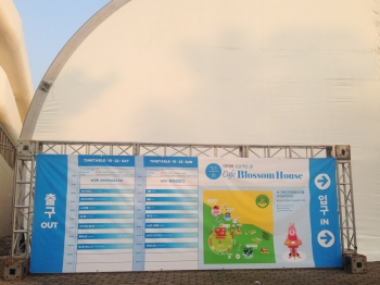 카페 블로썸 하우스 입구에 마련될 타임테이블과 포토월 / 한얼교에 위치한 대형 구조물. 사진은 끝나고 집으로 돌아가실 때 만나는 방향. 오실 때 만나는 모습도 기대해주세요.