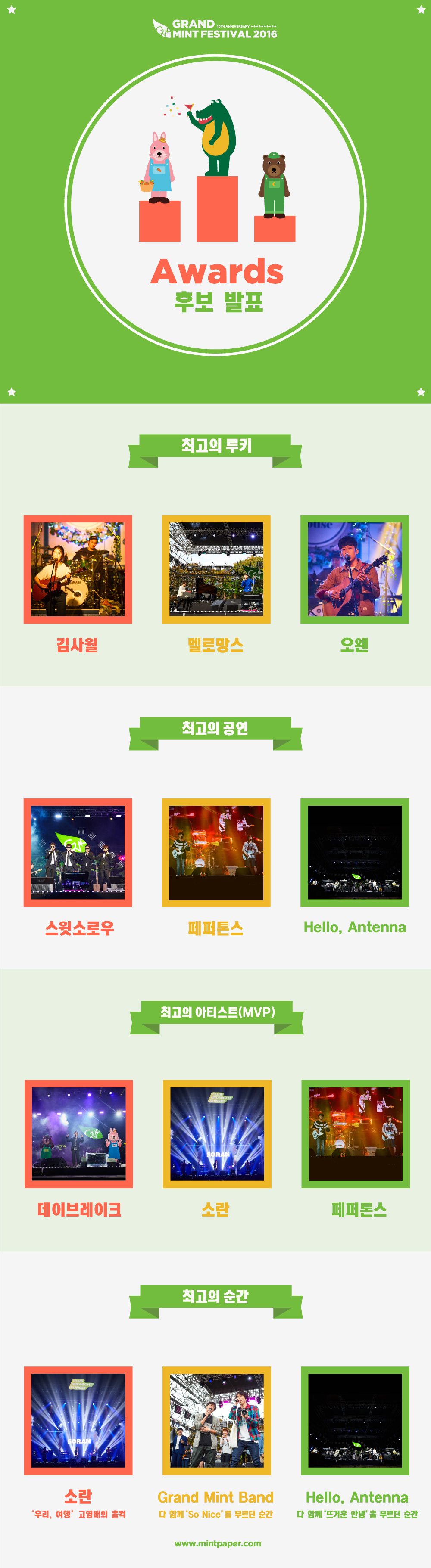 2021.10.19GMF2016 Awards에 참여해주셔서 감사합니다. 수상자는 11월 13일 일요일 진행되는 민트페스타 vol. 53 현장에서 발표되며, 민터 여러분의 의견(80%)와 스태프 의견(20%)를 반영하여 최종 결정됩니다.